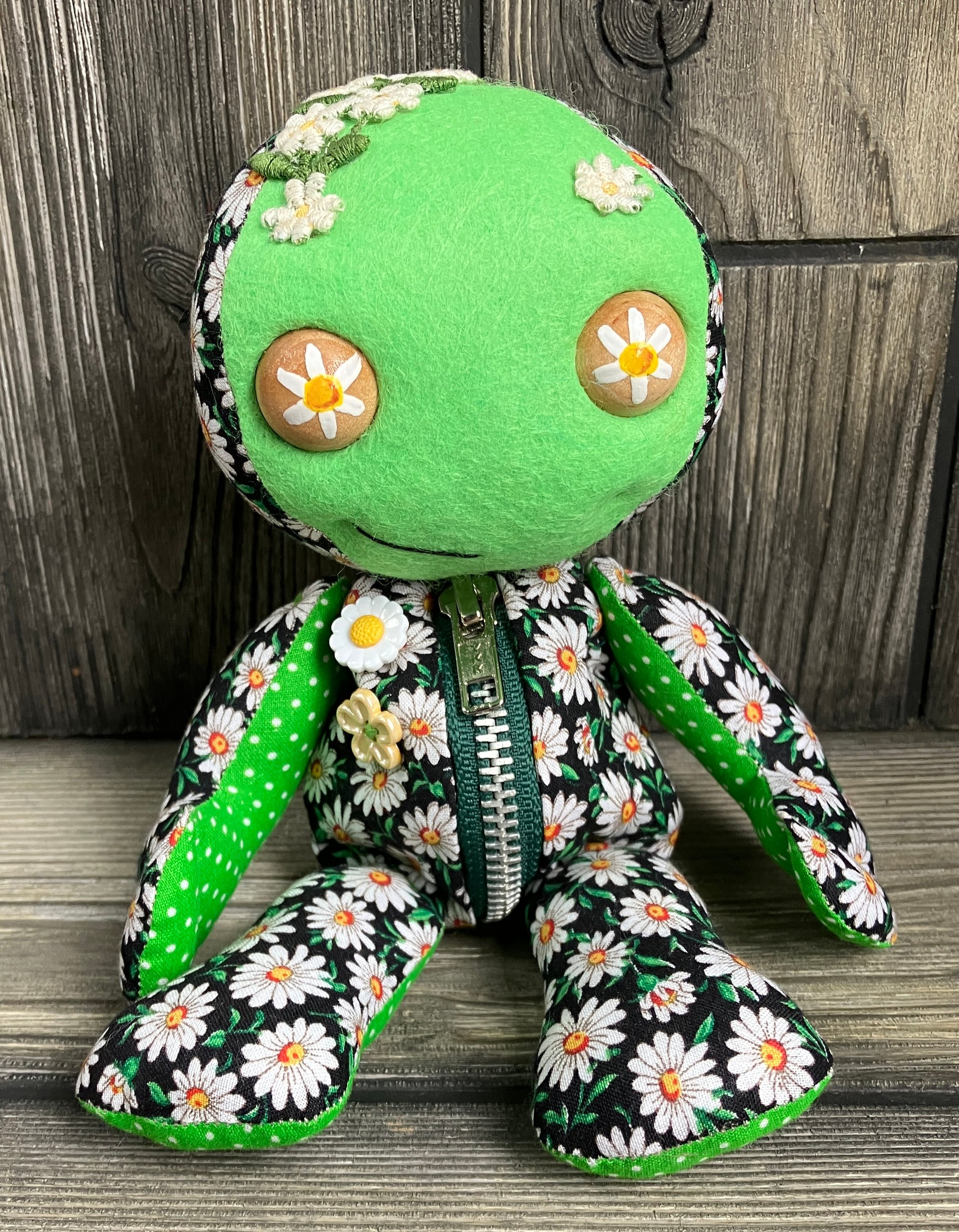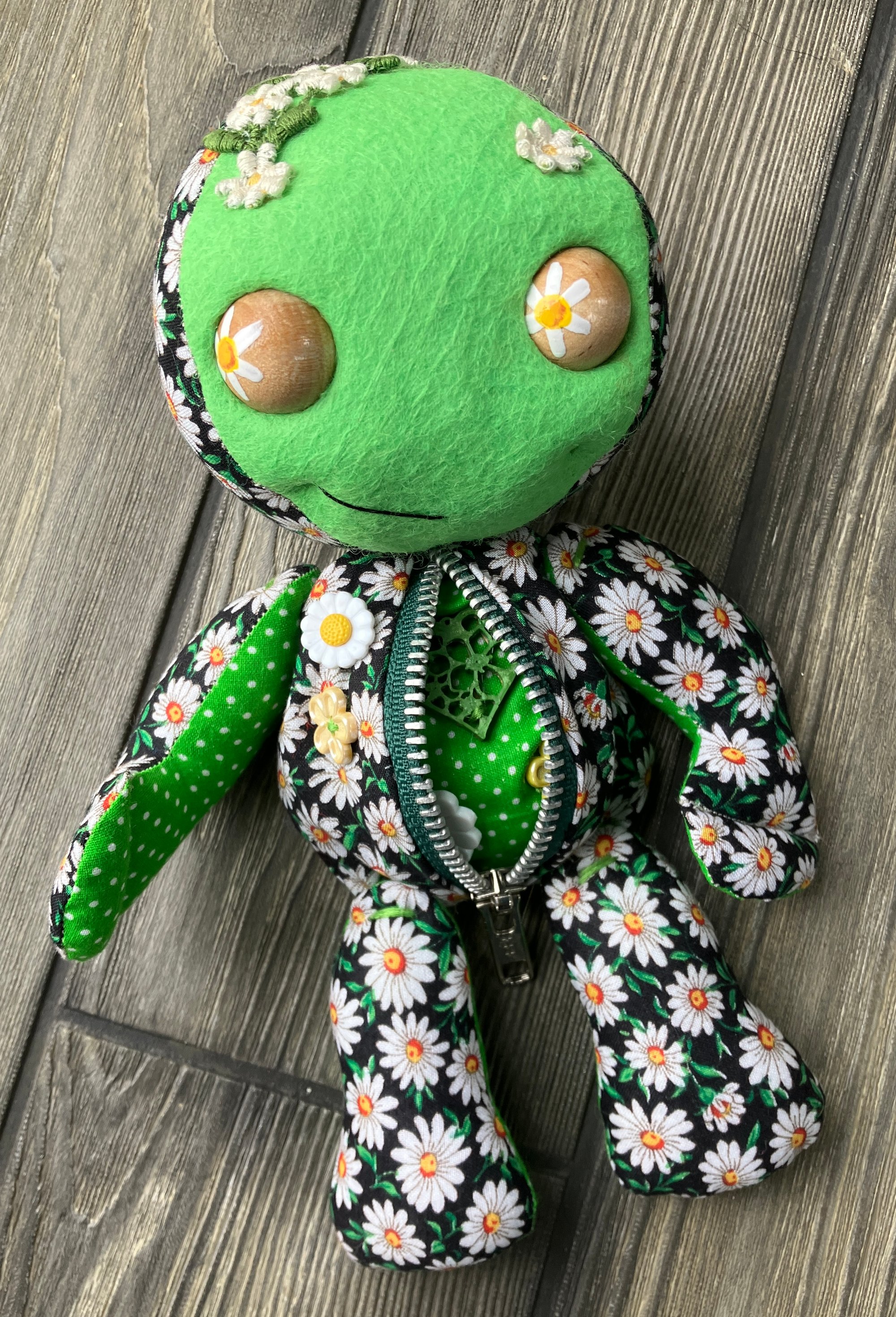 Daisy Baby!! Each 9” Tindle Baby has manually movable eyes (side to side only, moved by hand) and zippered tummy. The tummy insert can be removed so that you can place important trinkets inside. This baby has handstitched vintage 1970s daisy chain trim.