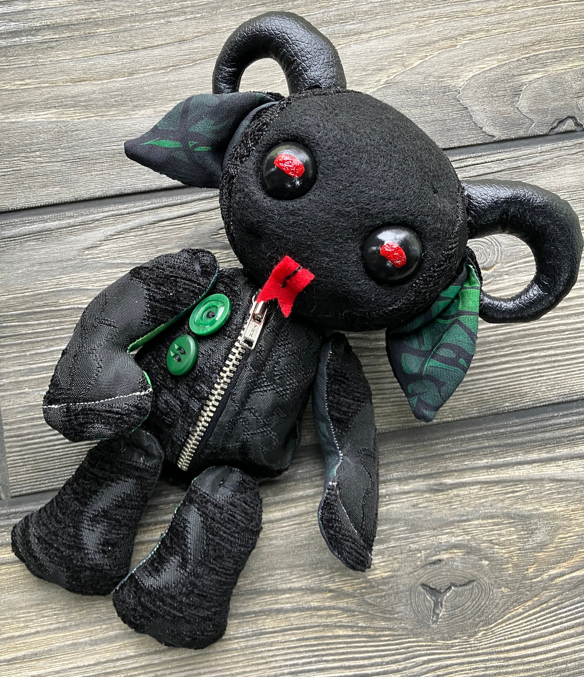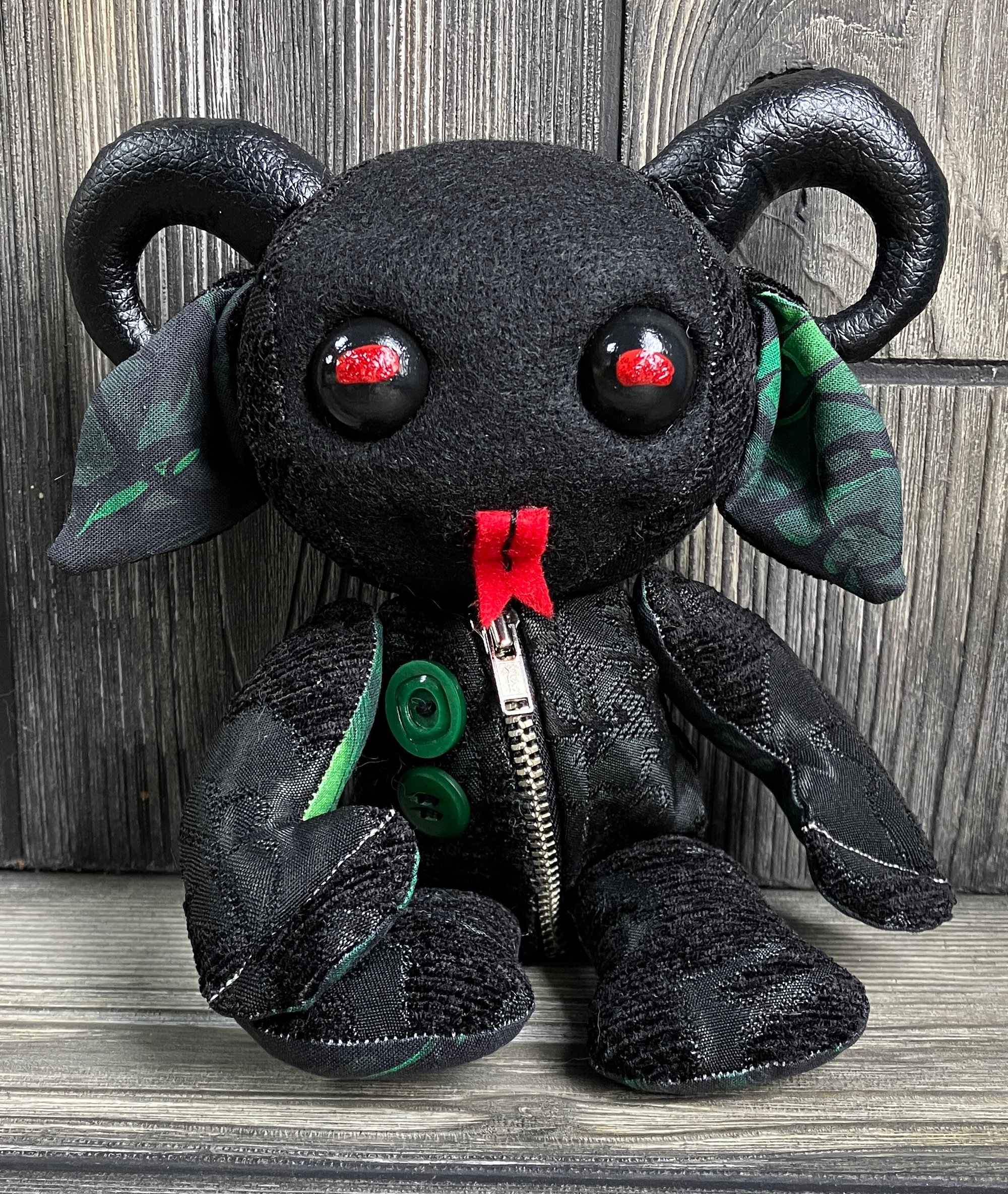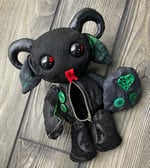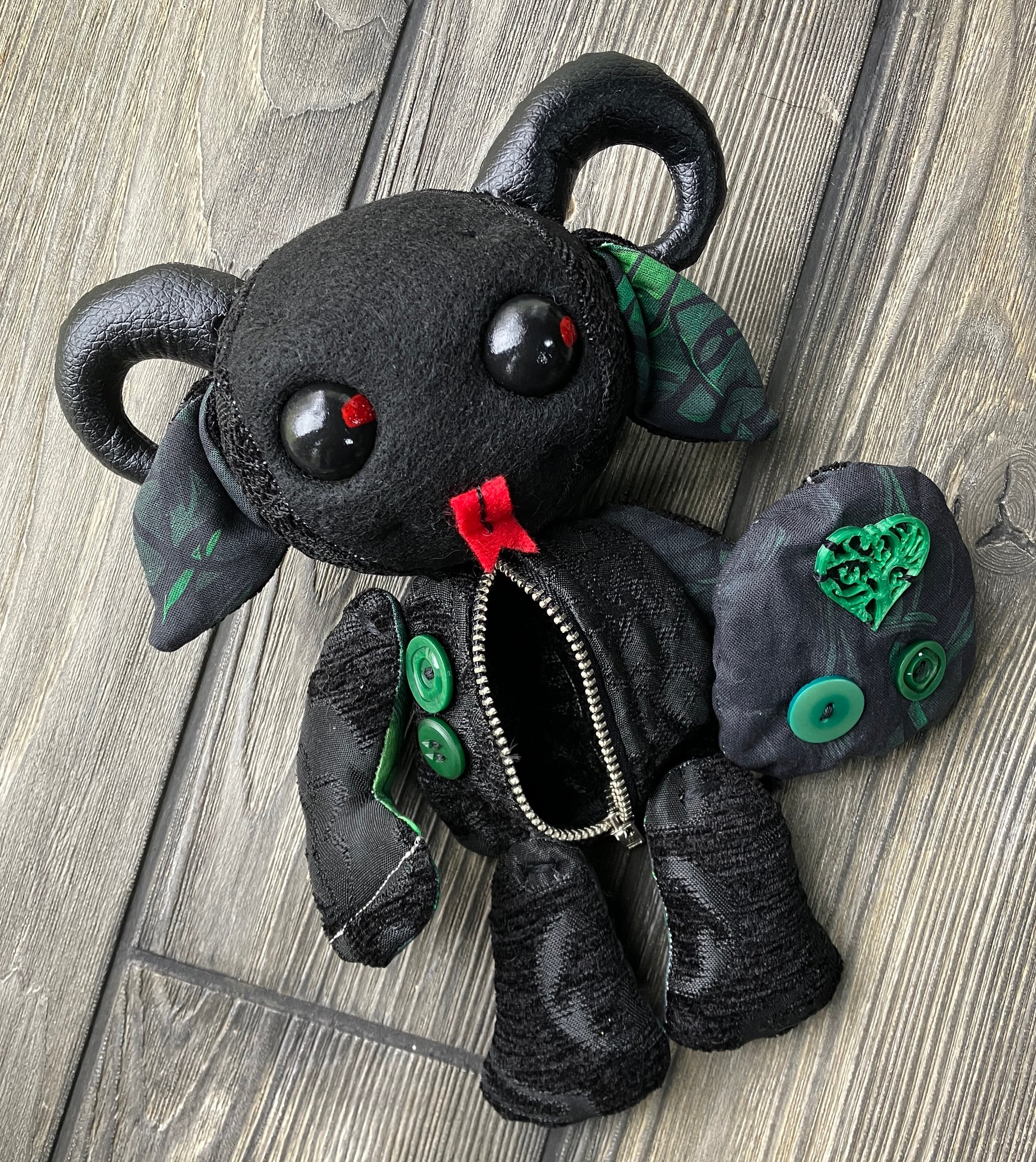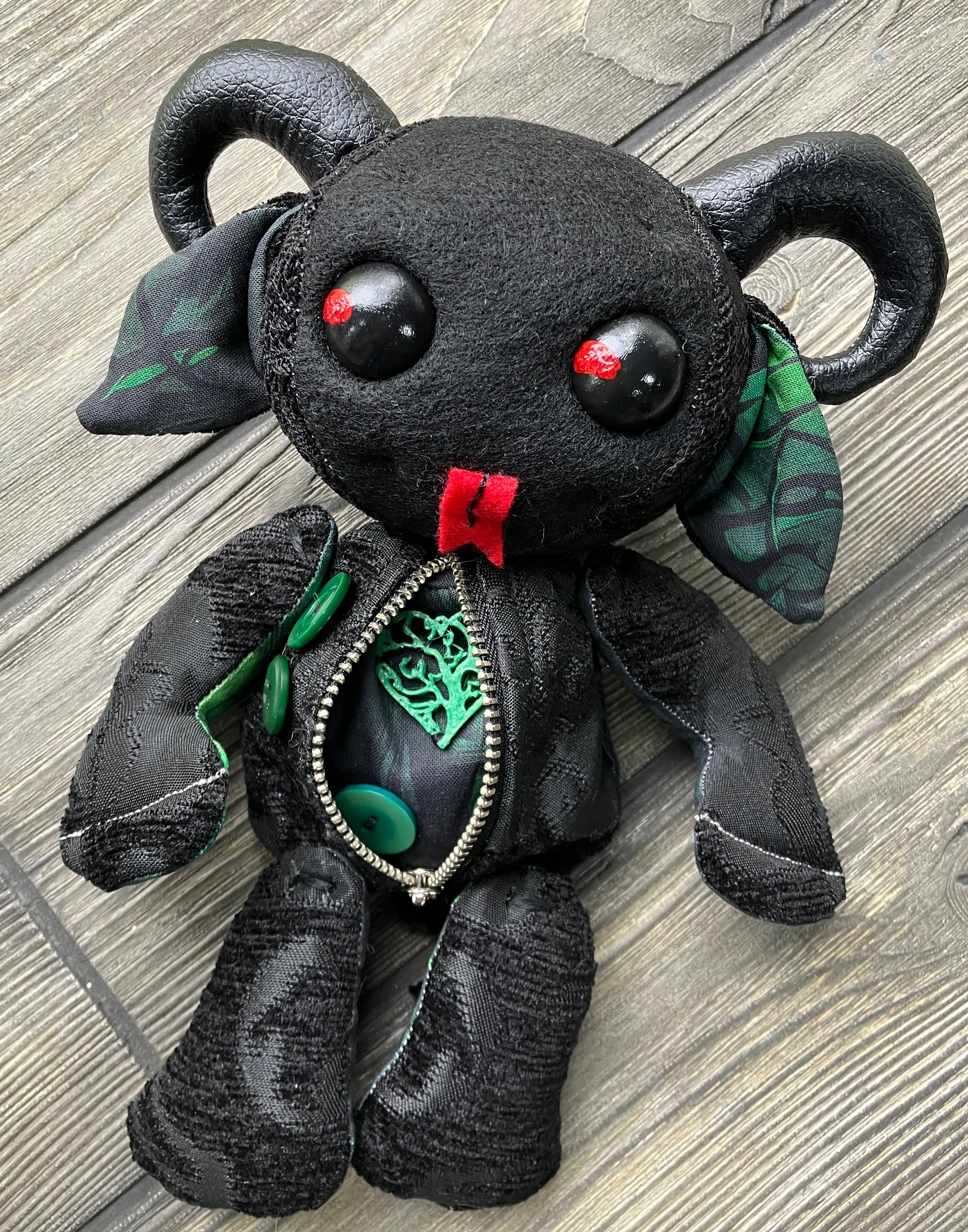 Krampus baby!!! Each 9” Tindle Baby has manually movable eyes (side to side only, moved by hand) and zippered tummy. The tummy insert can be removed so that you can place important trinkets inside.