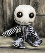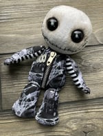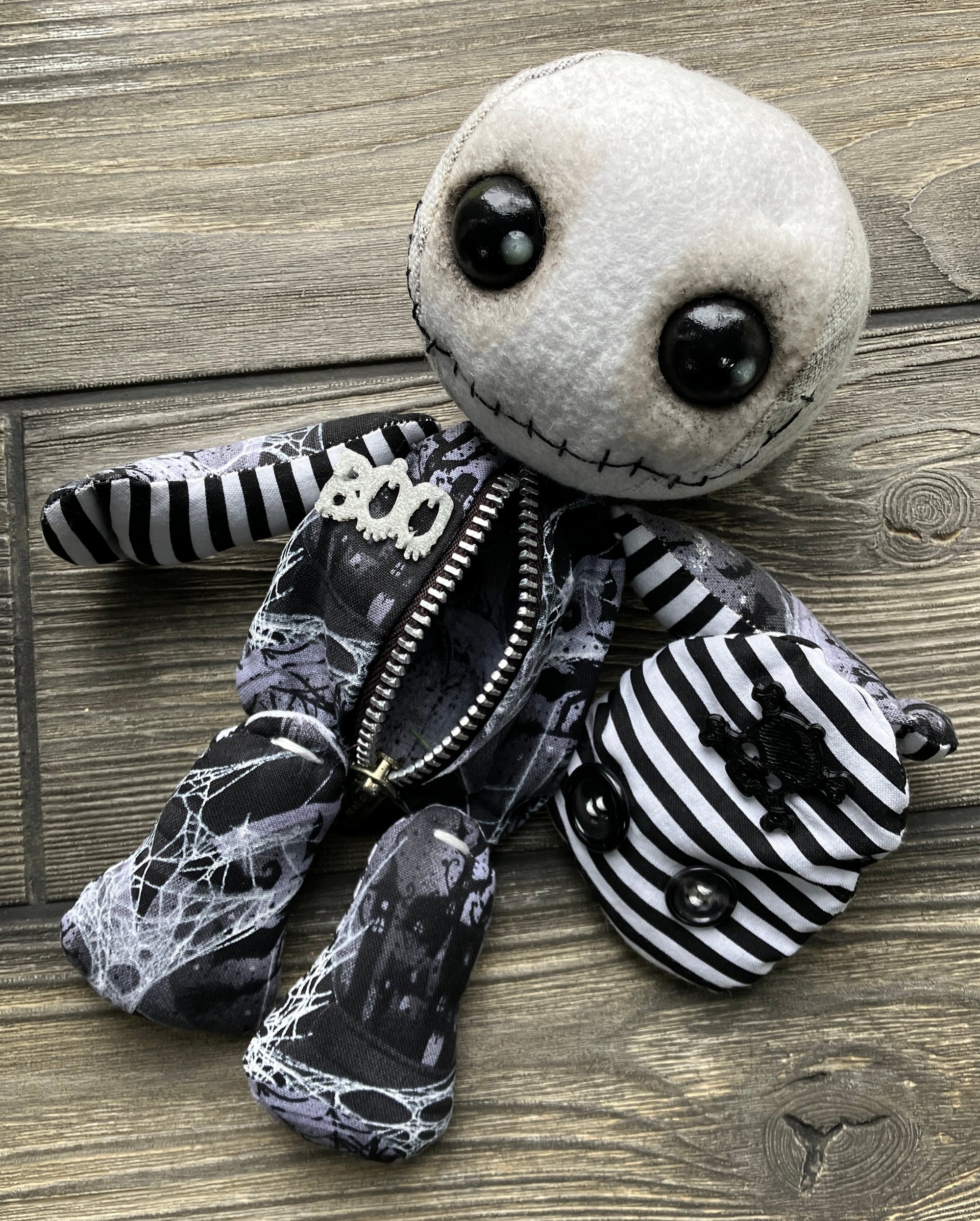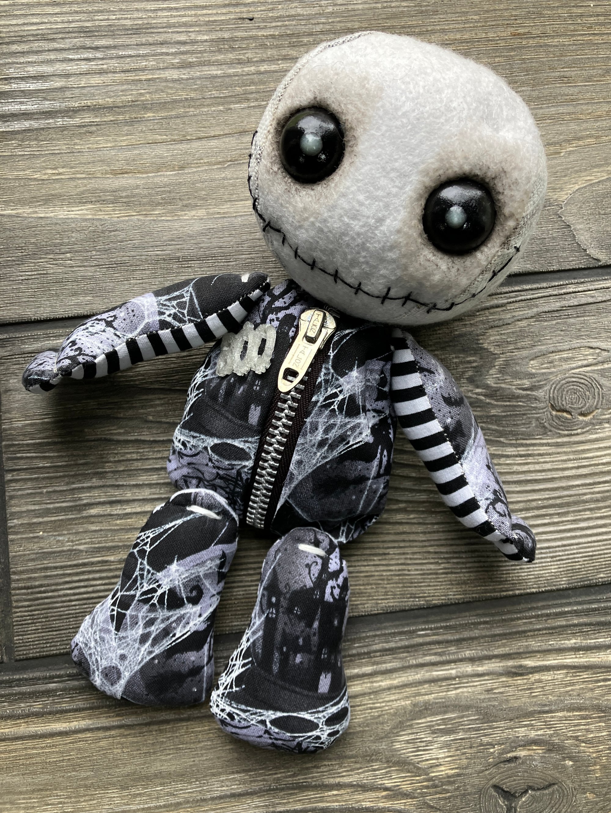 Skully baby!!! Each 9” Tindle Baby has manually movable eyes (side to side only, moved by hand) and zippered tummy. The tummy insert can be removed so that you can place important trinkets inside.