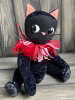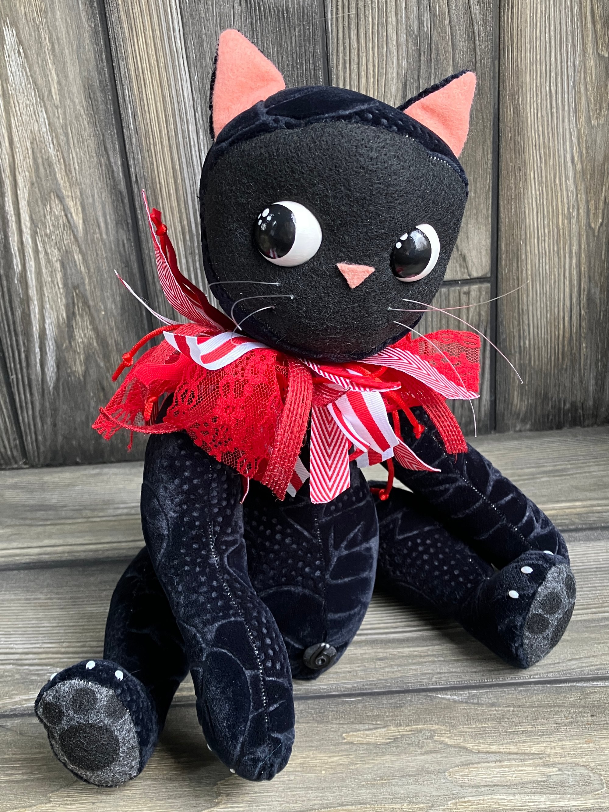 The Velveteen Cat is a 13" artist teddy bear is made from a hand drawn pattern exclusive to Tindle Bears and has the following features,