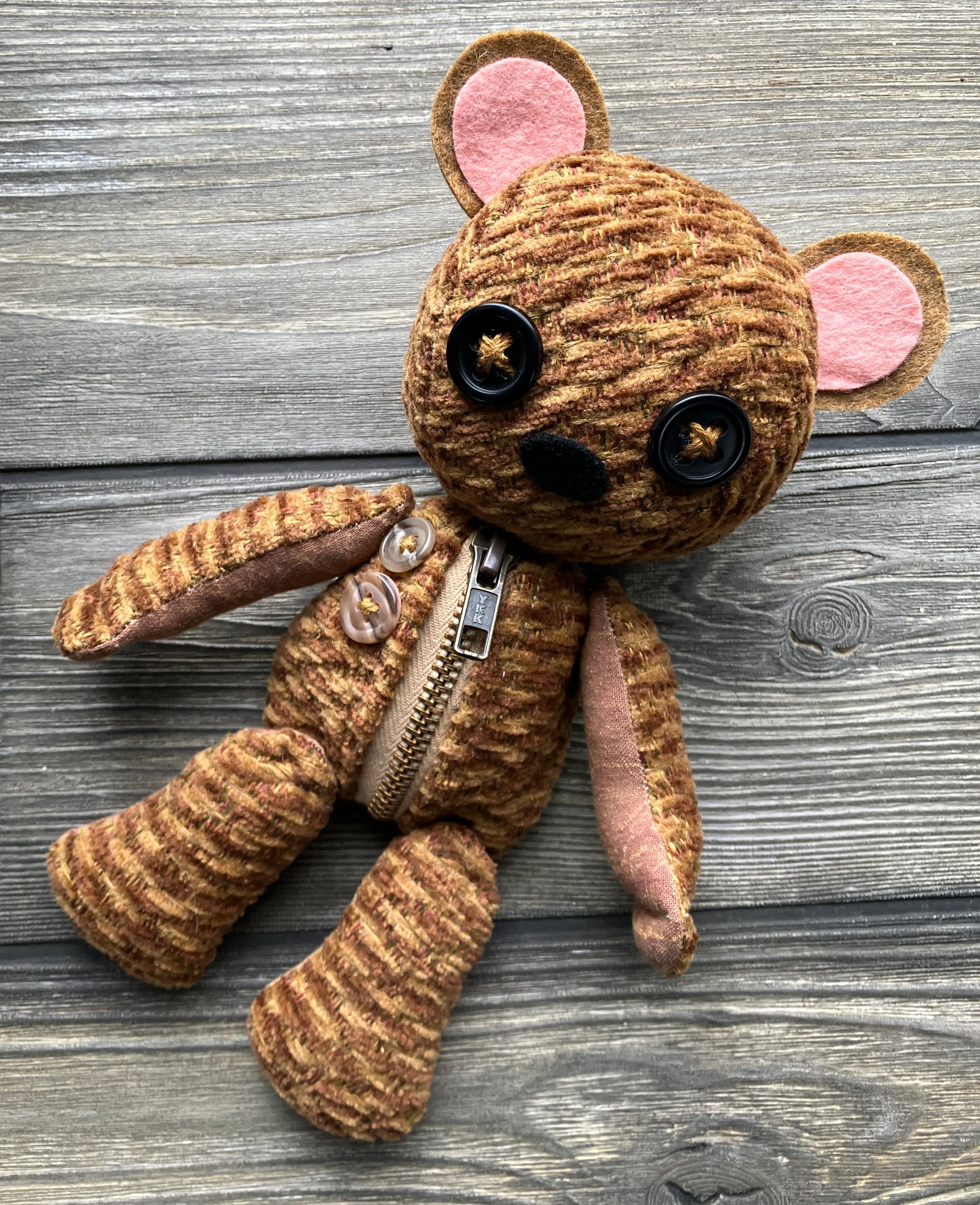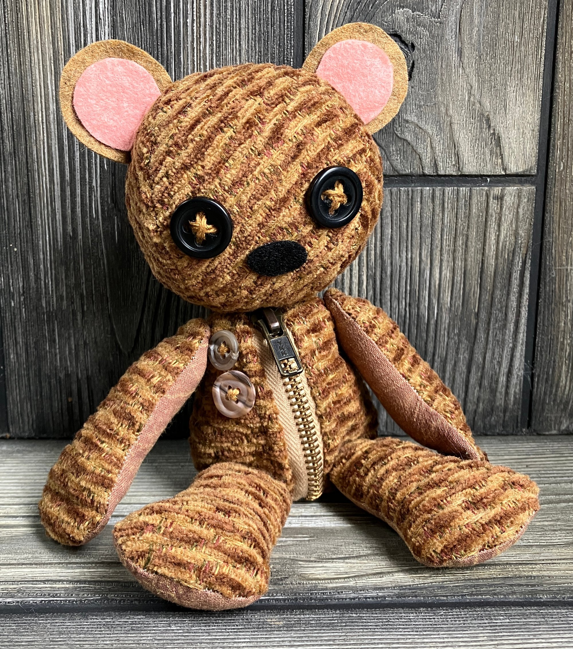 Pookie Bear baby!!! Each 9” Tindle Baby has a zippered tummy. The tummy insert can be removed so that you can place important trinkets inside. This teddy bear has stationary (non moving) button eyes.