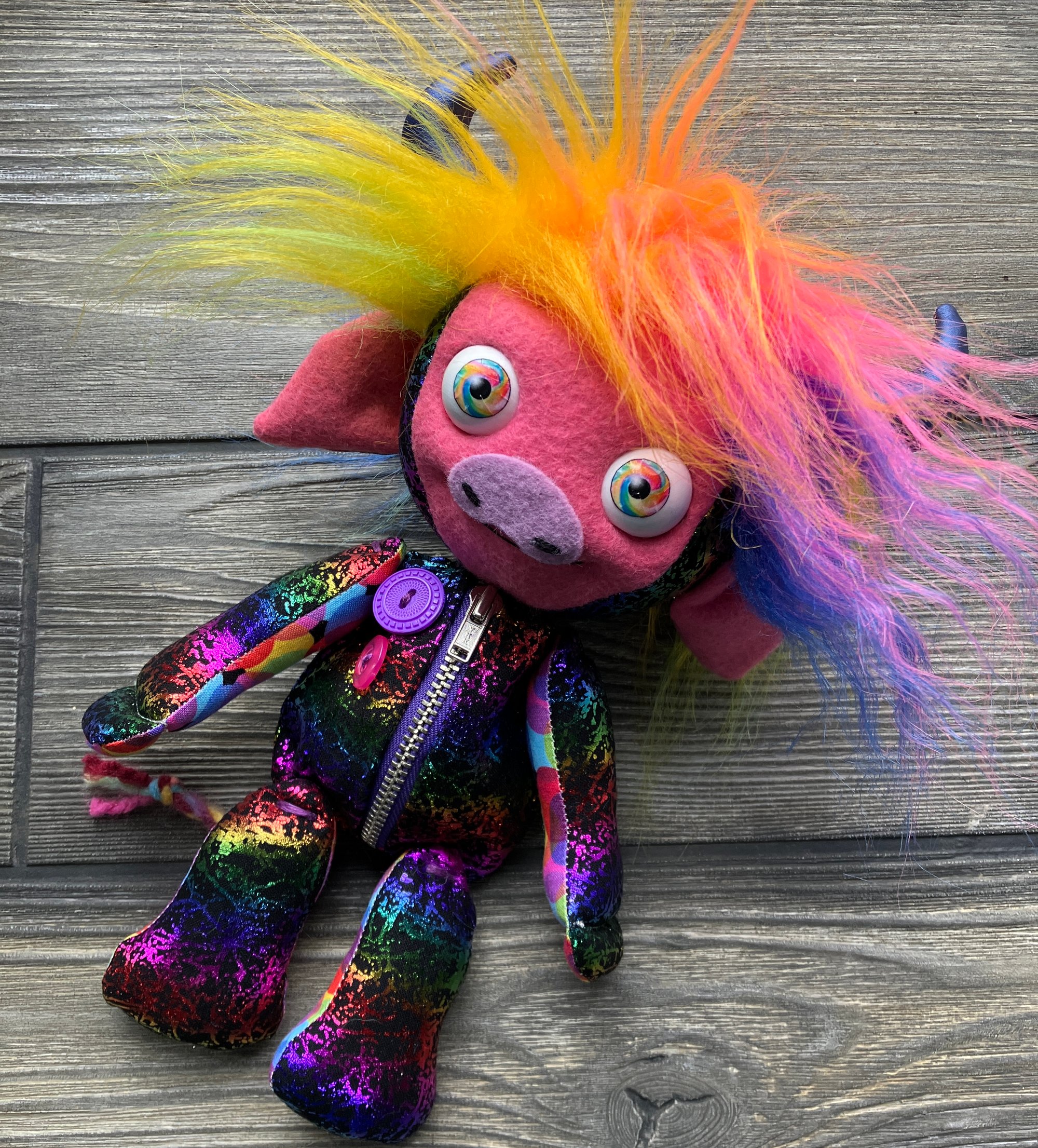 Rainbow Highland Cow baby!!! Each 9” Tindle Baby has manually movable eyes (side to side only, moved by hand) and zippered tummy. The tummy insert can be removed so that you can place important trinkets inside.