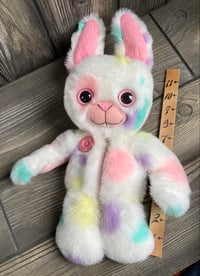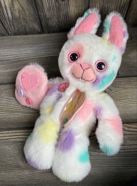 The Tindle BIG baby! This 11” bunny doll is made from super plush faux fur and has fixed custom painted eyes. Inside their tummy is a bean bag that features a unique custom heart. The tummy insert can be removed.