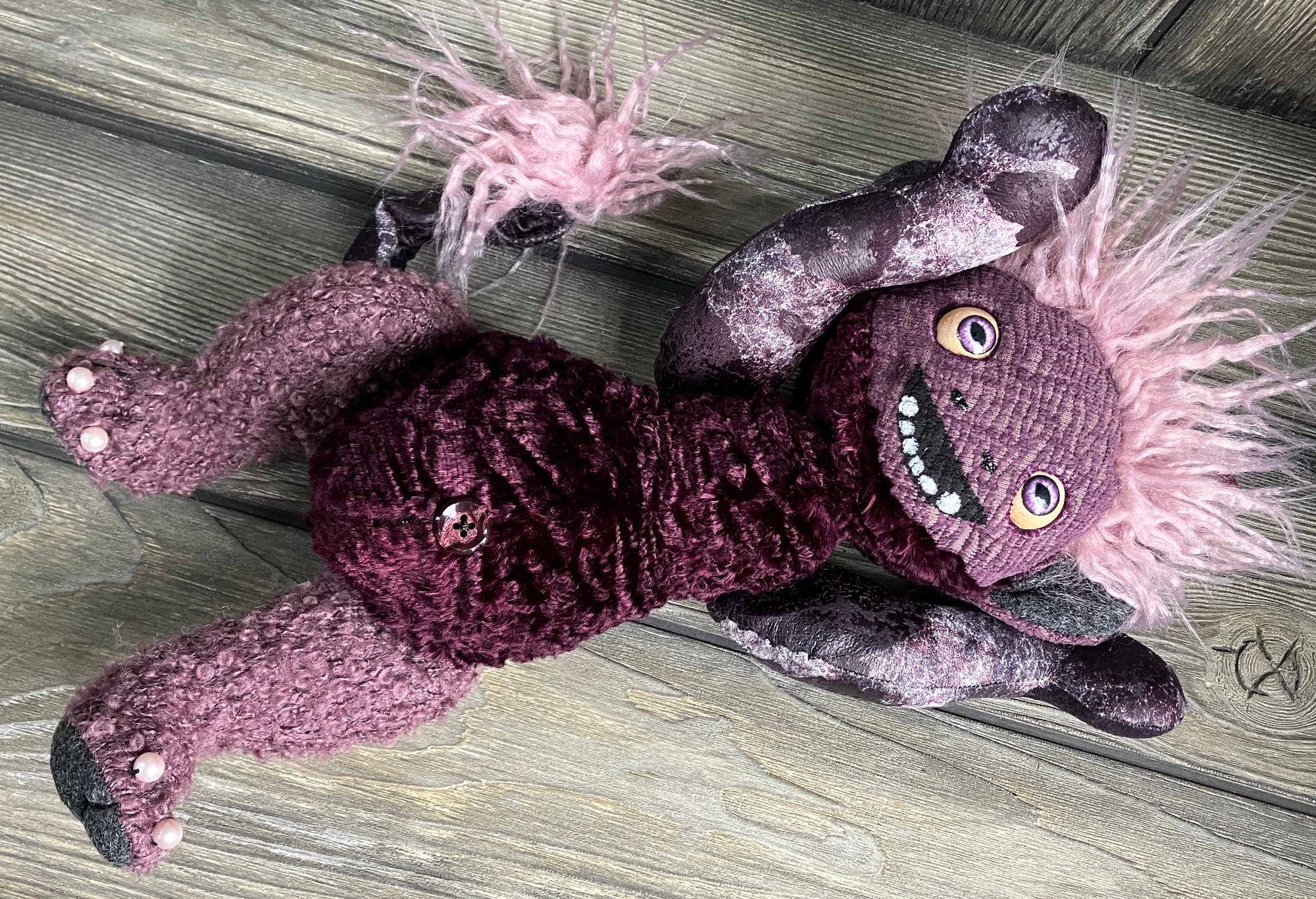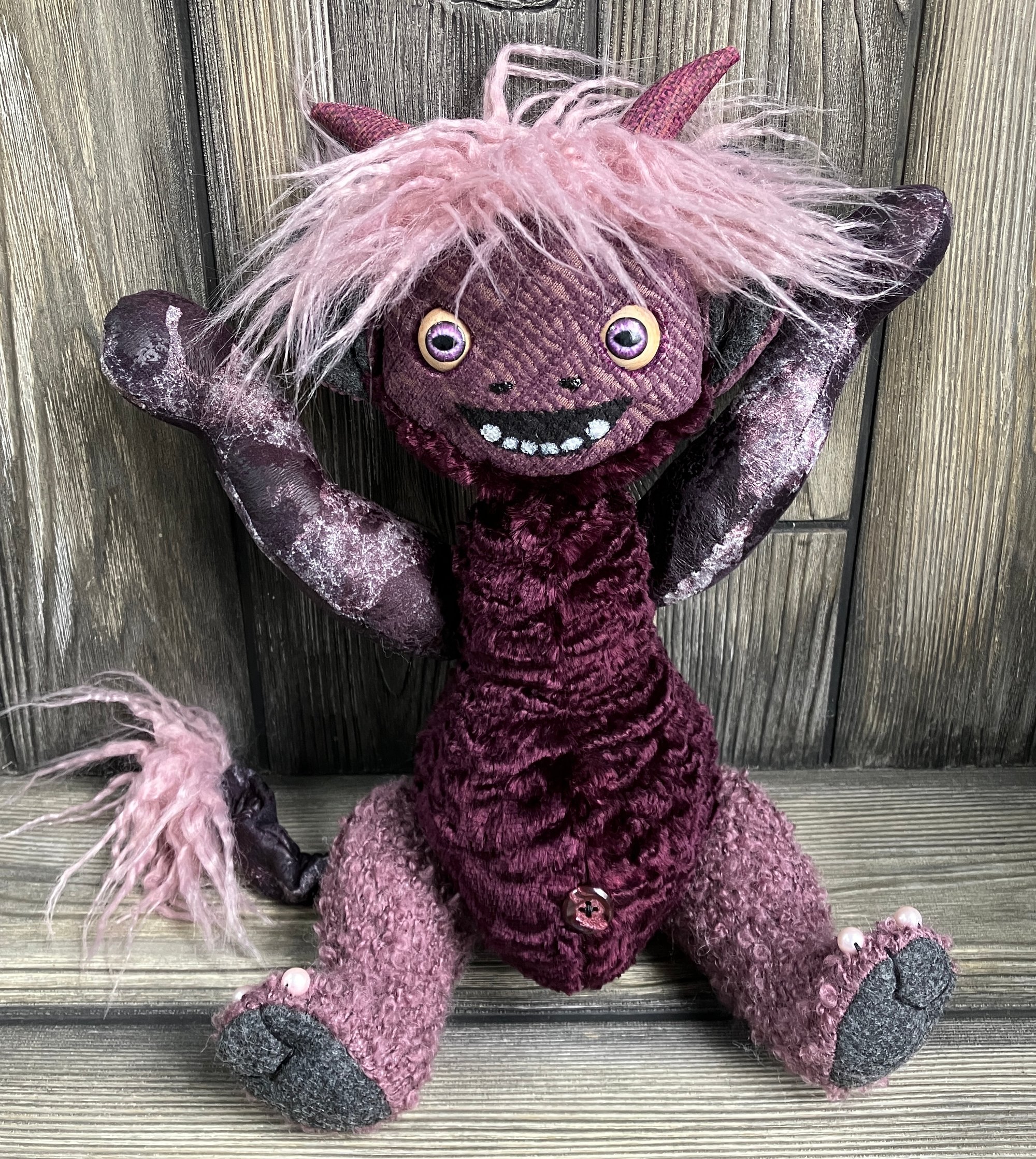 The Aubergine Monster is a 13" artist teddy bear is made from a hand drawn pattern exclusive to Tindle Bears and has the following features,